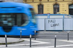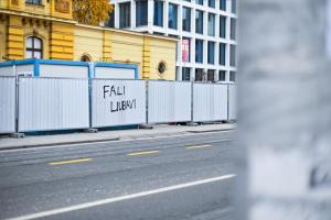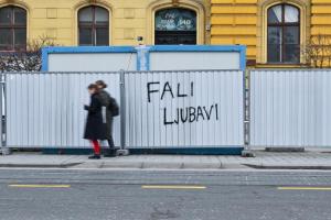 Zagreb, 16.12.2025 - Natpis Fali ljubavi na ogradi gradilista Skole primijenjene umjetnosti...