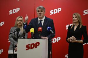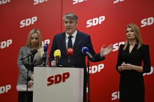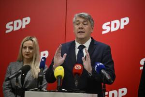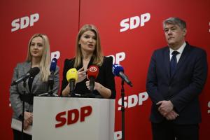 Zagreb, 19.02.2026 - Performans s dresovima na press konferenciji SDP-a povodom novoimenovanog...