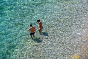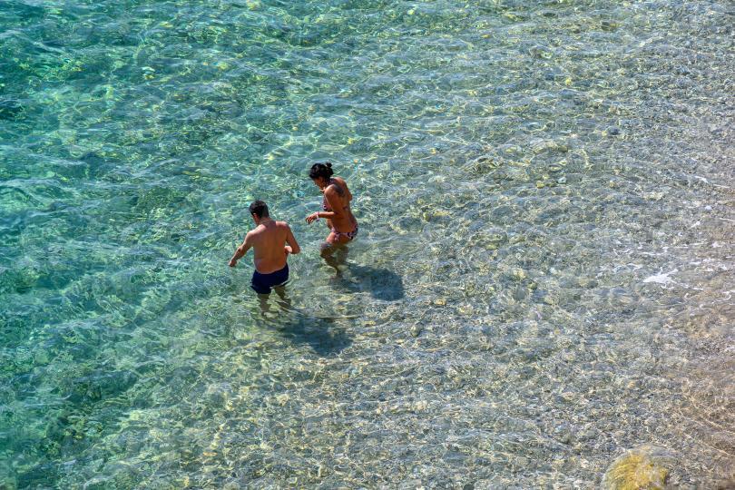 Prvi kupaci uzivaju u suncanom proljetnom danu na plazi Banje