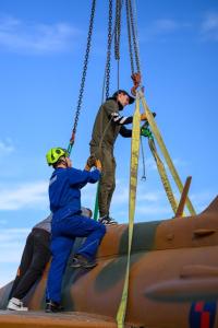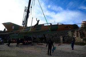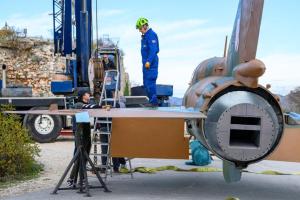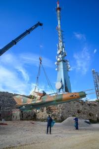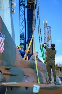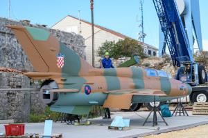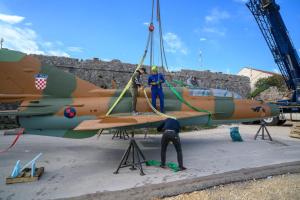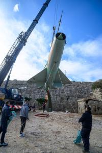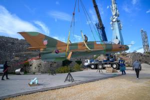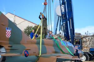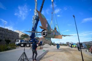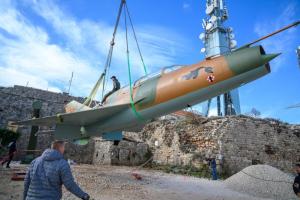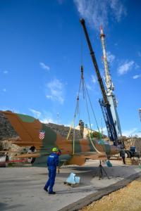 Dubrovnik, 02.12.2025 - Postavljanje borbenog zrakoplova MIG na postolje na Srdju