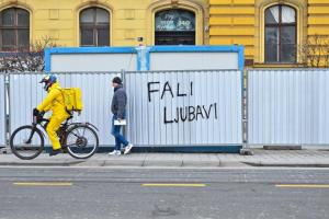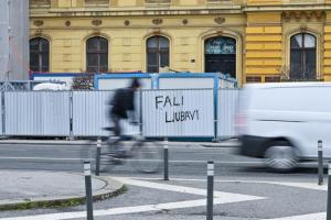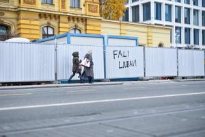 Zagreb, 16.12.2025 - Natpis Fali ljubavi na ogradi gradilista Skole primijenjene umjetnosti...