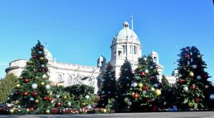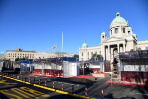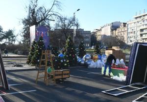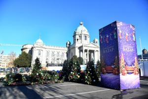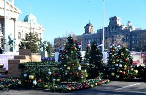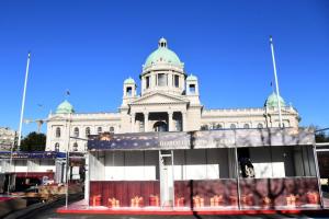 Beograd, 29.12.2025 - Novogodisnji ukrasi postavljaju se ispred Narodne skupstine nakon sto...