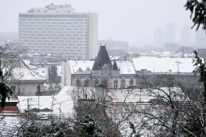 Zagreb, 05.01.2026 - Pogled s Gornjeg grada na krovove prekrivene snijegom