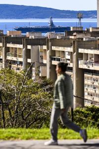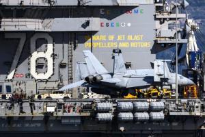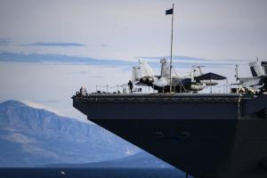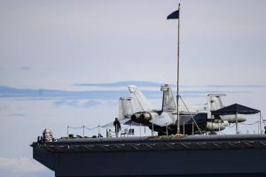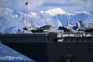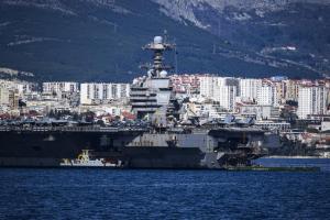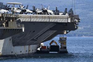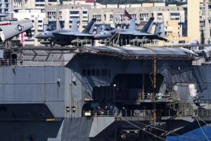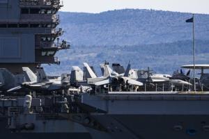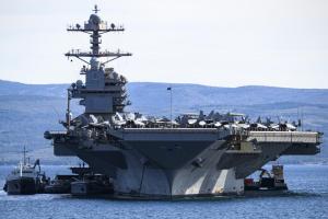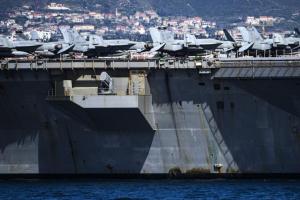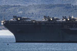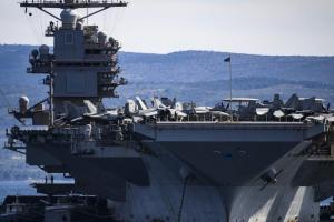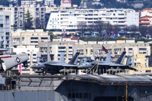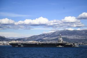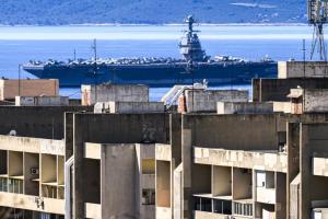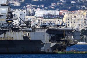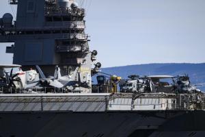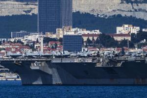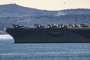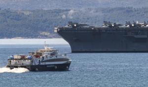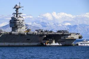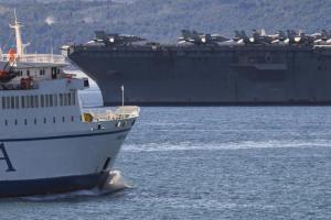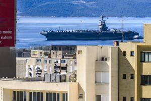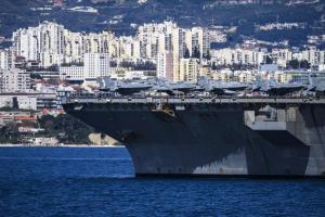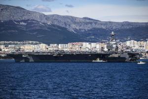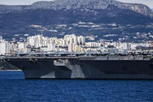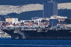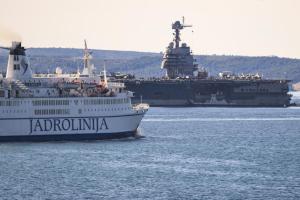 Split, 30.03.2026 - Nosac zrakoplova USS Gerald R. Ford usidren ispred trajektne luke